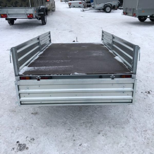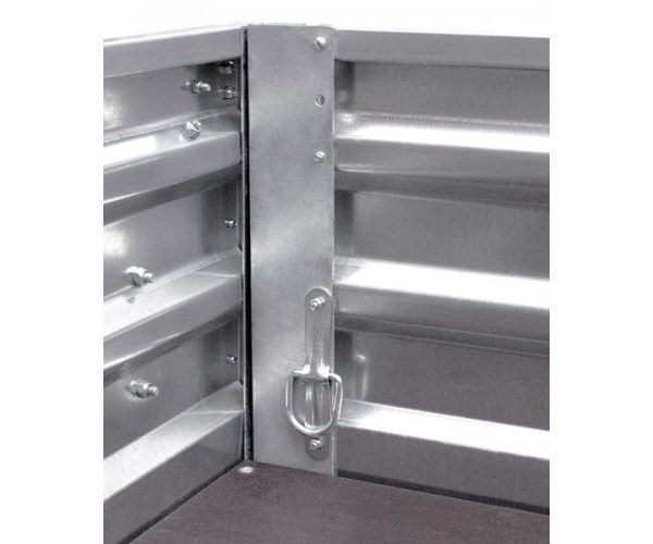 - Оцинкованные стальные борта с ребрами жесткости повышают устойчивость бортов при различных нагрузках. Стальные стойки бортов оборудованы петлями для крепления груза (4 шт). Передний и задний борт откидные.
