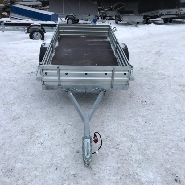 - В базовую комплектацию прицепа входит: колёса R13, один ряд бортов (290 мм), сцепная головка (750 кг), петли для крепления груза (4 шт), страховочные цепи (2 шт), держатель вилки, противооткатные упоры (2 шт).