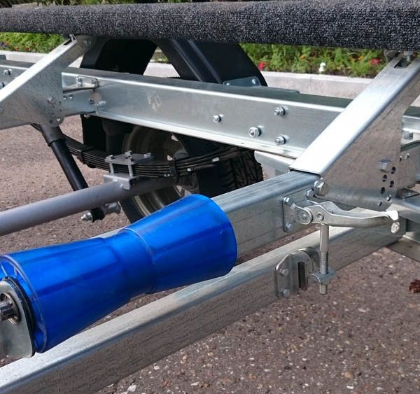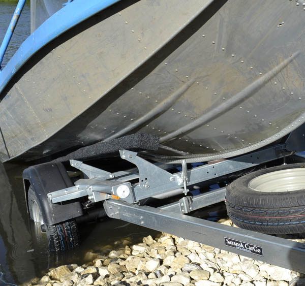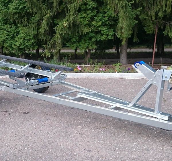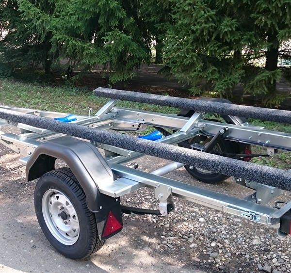 - Плавный ход прицепу обеспечивает подвеска на рессорах с резиновыми подрессорниками, основные узлы подвески применены от серийно выпускаемых автомобилей отечественного производства. Ложементы четырехопорные за счет регулировок позволяют устанавливать маломерные суда с разной геометрией корпуса.